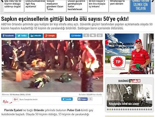 The newspaper, Yeni Akit, which has supported Al-Qaeda in the past and is known for its hate speech against LGBT groups, Jews and Christians put up the news with the headline 'Death toll rises to 50 in bar where perverted homosexuals go!'